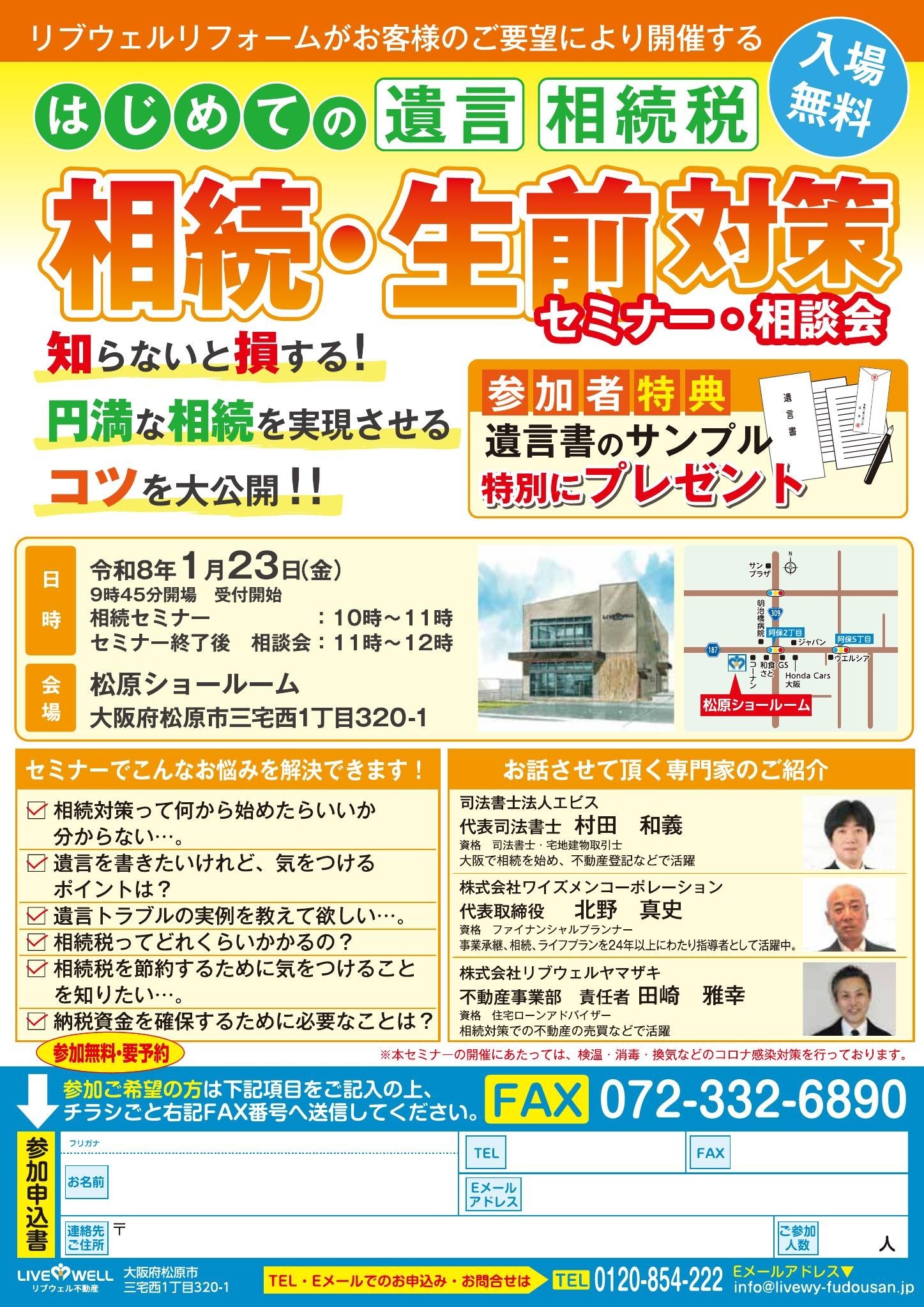 | イベント概要 【相続・生前対策セミナー】 子や孫にできるだけ相続税をかけずに資産を遺してあげたい 親からの相続をできるだけ相続税をかけずに受け取りたい そんな方に向けての無料セミナーです! 税金対策はどうすれば良い? 相続した不動産を売却したらどのくらい税金がかかる? 遺言書の書き方は? そんな疑問にもお答えします。 実際に保険屋さんや司法書士事務所に足を運んで聞くのは抵抗がある方も沢山おられると思います。 そんな方のために、セミナー後は個別相談も可能です! 毎回沢山の方にご参加いただいておりますので、是非この機会にお気軽にご参加ください♪ |