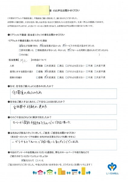 中古戸建ご購入 拡大 S様 中古戸建をご購入 担当者の人柄:★★★★★ 質問に対する回答の速さ:★★★★ 提案の的確さ:★★★★ ◆リブウェル不動産・担当者へのご意見及びご感想◆ 一から十まで丁寧にご対応頂いてありがとうございました。 担当者のコメント この度は、弊社を通じて物件をご購入頂きありがとうございました(^^) 担当:河辺 太一