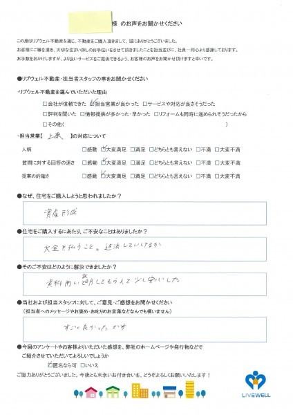 中古戸建ご購入 拡大 Y様 中古戸建をご購入 担当者の人柄:★★★★ 質問に対する回答の速さ:★★★★ 提案の的確さ:★★★★ ◆リブウェル不動産・担当者へのご意見及びご感想◆ すごく良かったです 担当者のコメント この度は、弊社を通じて物件をご購入頂きありがとうございました(^^) 担当:上原 悠希