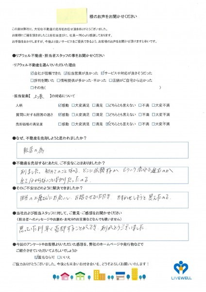 戸建住宅ご売却 拡大 T様 中古戸建をご売却 担当者の人柄:★★★★★ 質問に対する回答の速さ:★★★★★ 売却価格の満足度:★★ ◆リブウェル不動産・担当者へのご意見及びご感想◆ 思っていたより早く売却することができありがとうございました。 担当者のコメント この度は、大切な不動産のご売却を弊社にお任せ頂きありがとうございました(^^) 担当:上原 悠希