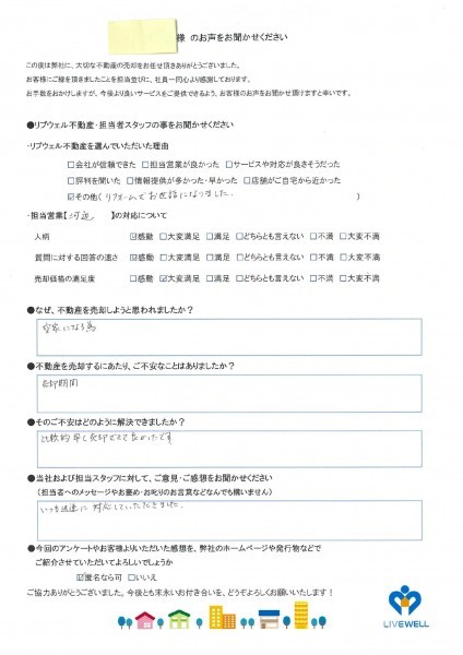 戸建住宅ご売却 拡大 Y様 中古戸建をご売却 担当者の人柄:★★★★★ 質問に対する回答の速さ:★★★★★ 売却価格の満足度:★★★★ ◆リブウェル不動産・担当者へのご意見及びご感想◆ いつも迅速に対応していただきました。 担当者のコメント この度は、大切な不動産のご売却を弊社にお任せ頂きありがとうございました(^^) 担当: