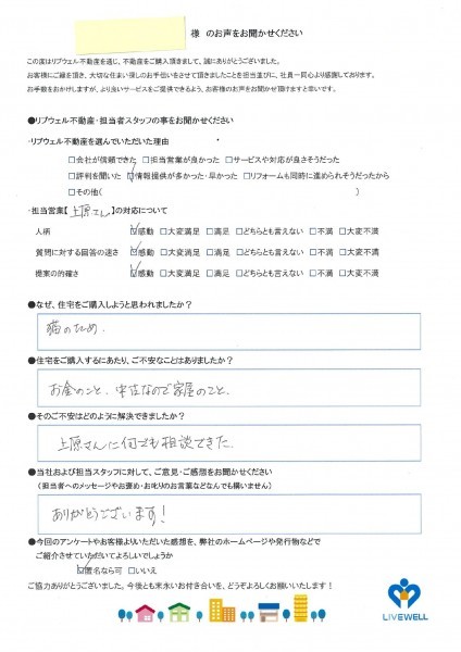 中古戸建ご購入 拡大 H様 中古戸建をご購入 担当者の人柄:★★★★★ 質問に対する回答の速さ:★★★★★ 提案の的確さ:★★★★★ ◆リブウェル不動産・担当者へのご意見及びご感想◆ ありがとうございます! 担当者のコメント この度は、弊社を通じて物件をご購入頂きありがとうございました(^^) 担当:上原 悠希