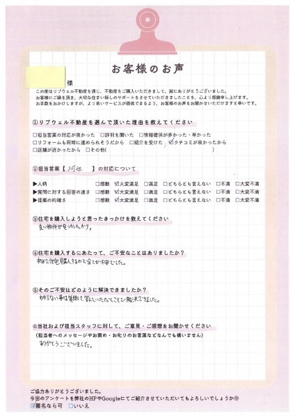 中古戸建ご購入 拡大 Y様 中古戸建をご購入 担当者の人柄:★★★★★ 質問に対する回答の速さ:★★★★★ 提案の的確さ:★★★★★ ◆リブウェル不動産・担当者へのご意見及びご感想◆ ありがとうございました。 担当者のコメント この度は、弊社を通じて物件をご購入頂きありがとうございました(^^) 担当:河辺 太一